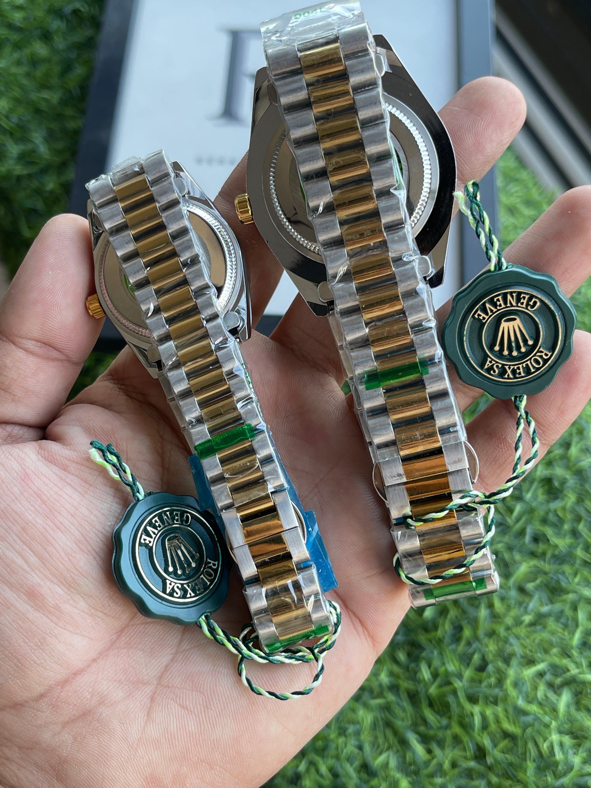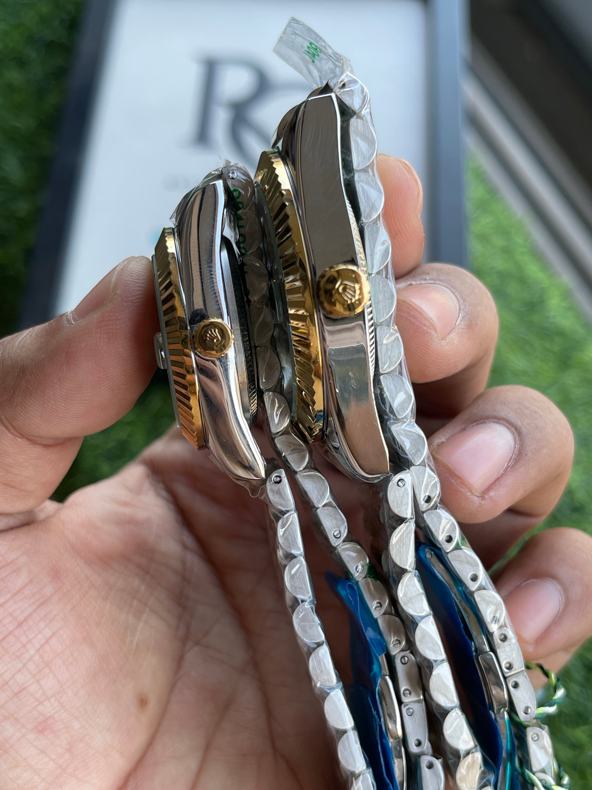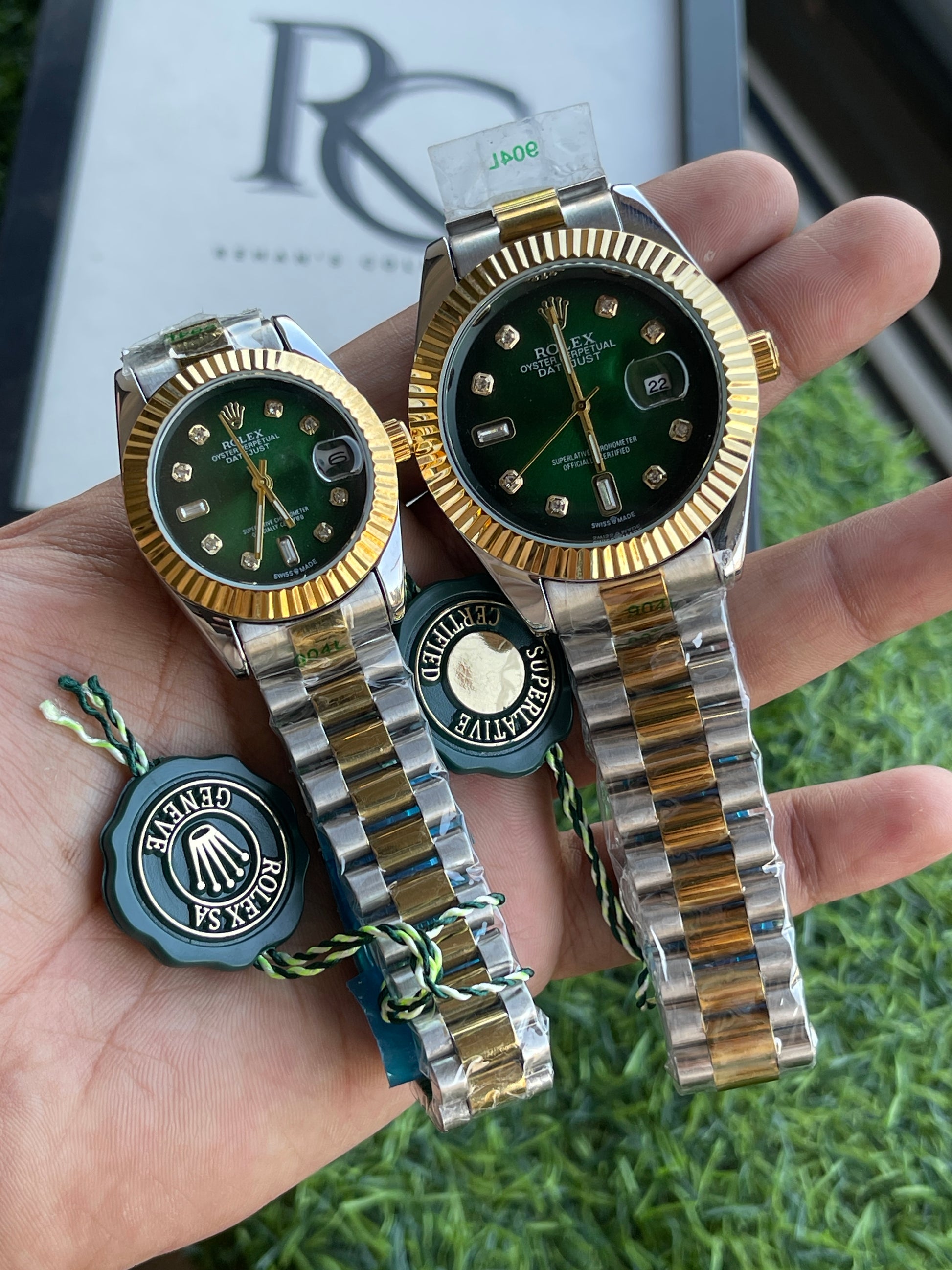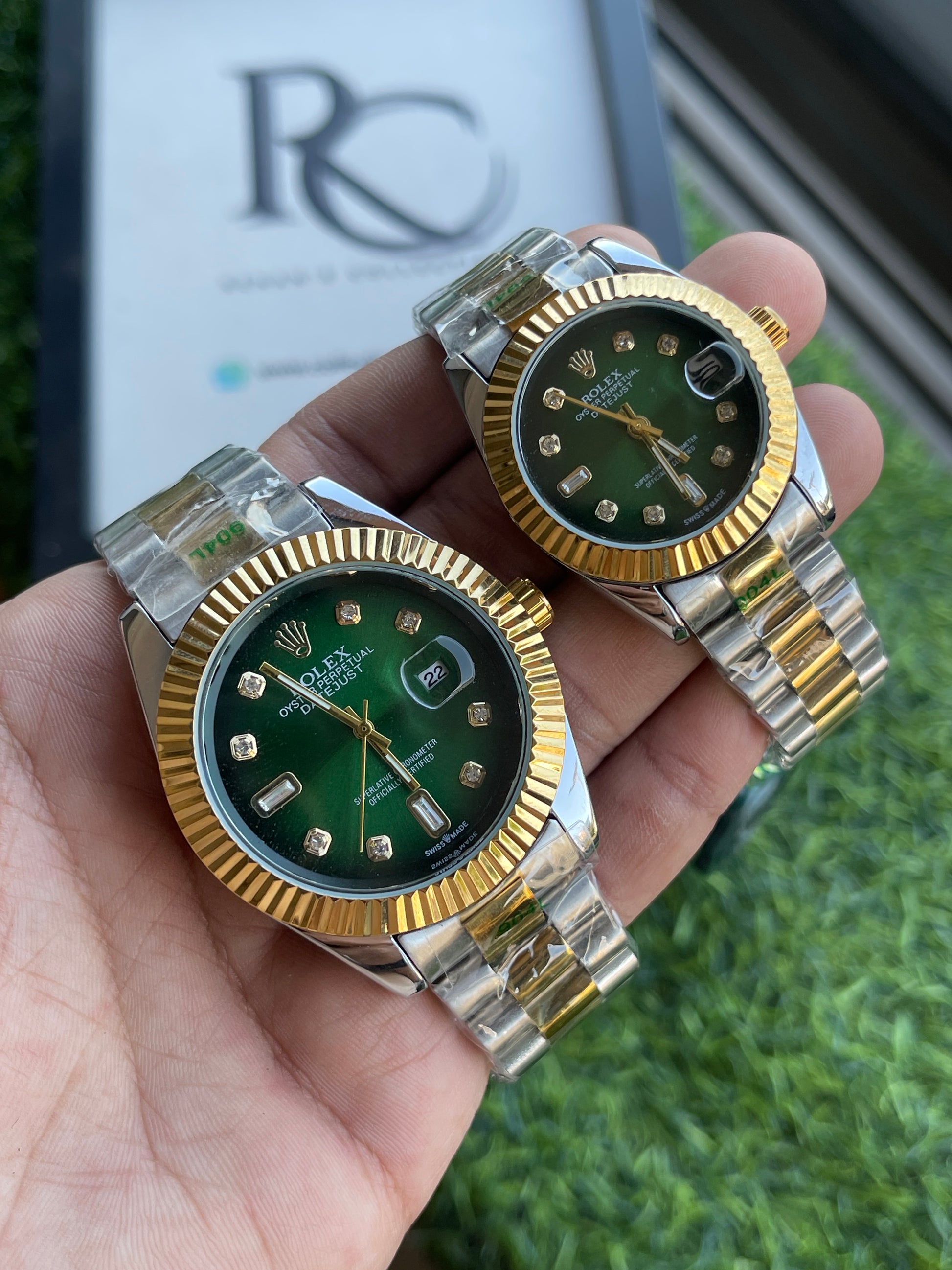 RC RLX Luxury Green Dial Couple Watch Set – Gold & Silver Two-Tone Design