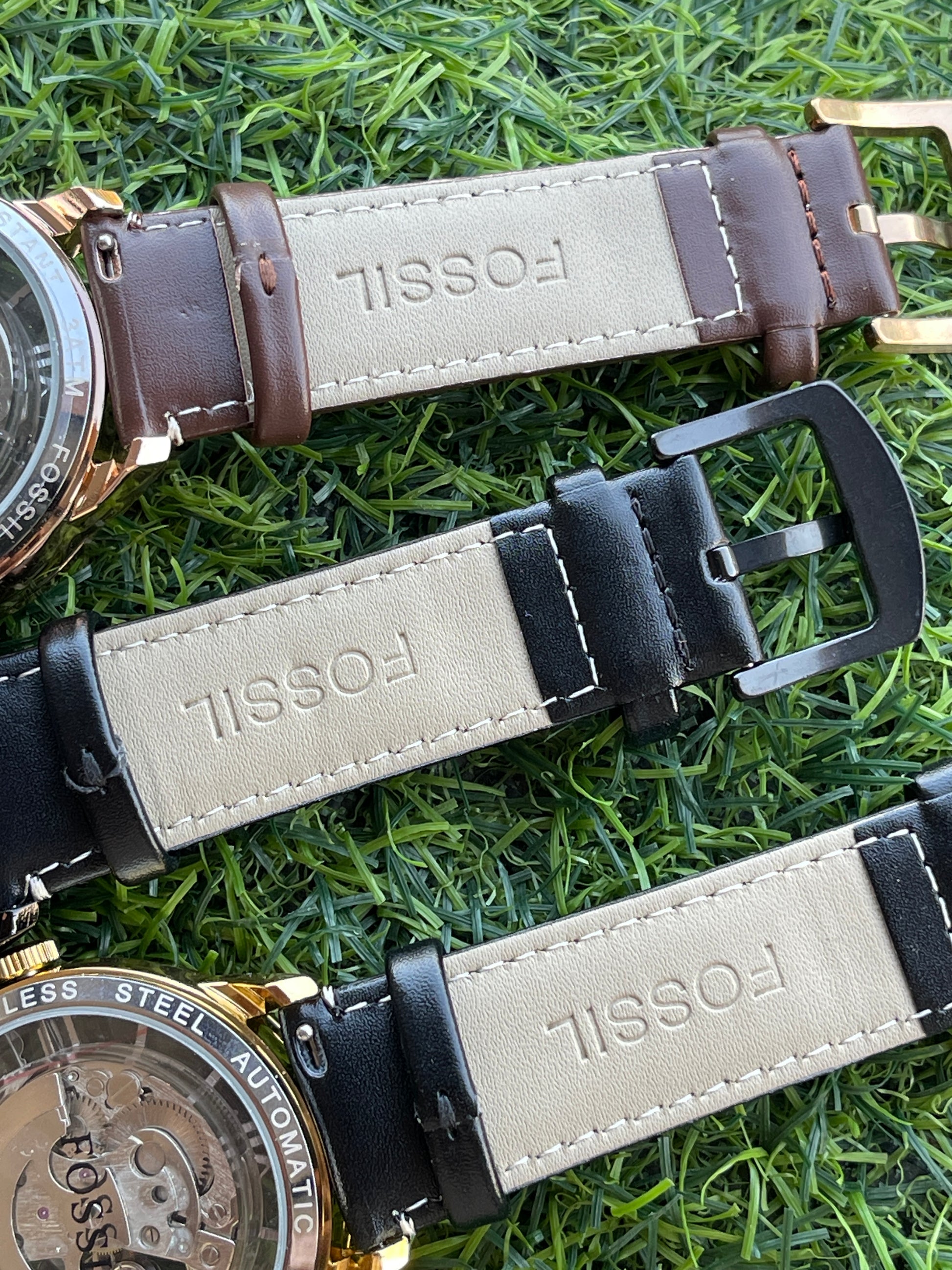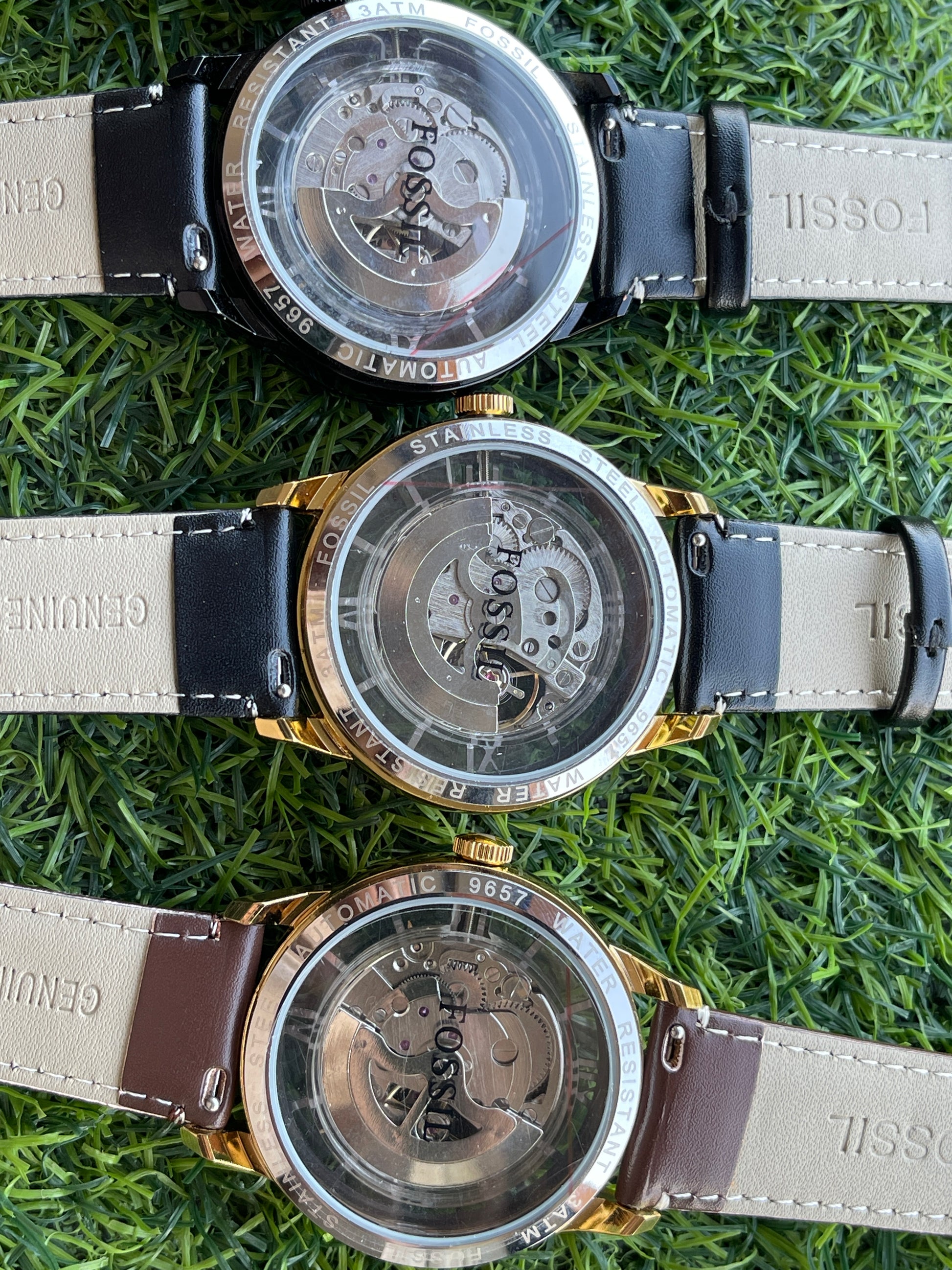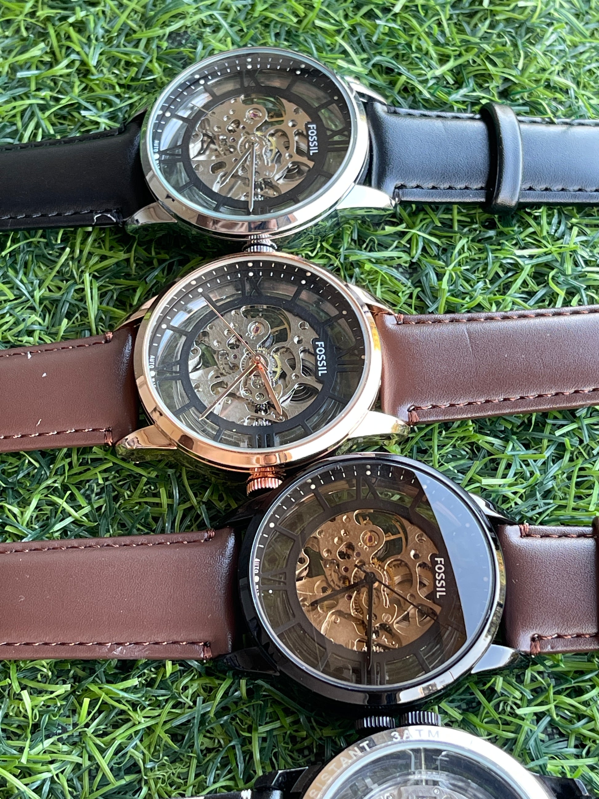 RC Fossiil Skeleton Automatic Watch – Gold Case with Brown Leather Strap